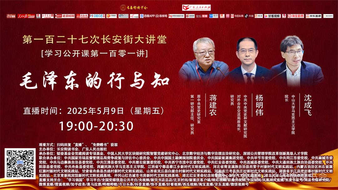 2025年5月9日(星期五)19:00-20:30,由长安街读书会联合广东人民出版社主办,特邀原中央党史研究室第一研究部主任、研究员蒋建农,中央党史和文献研究院对外合作交流局原局长、研究员杨明伟,中山大学马克思主义学院院长沈成飞等主讲“的行与知”。