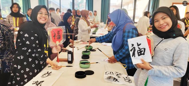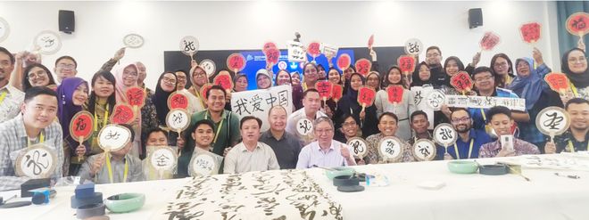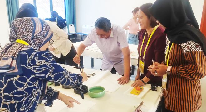 大湾区教育研究院陈二泉院长通过生动有趣的演示,让东盟教师懂得了“笔软则奇怪生矣”中国毛笔书法精髓,讲解了“龙”“福”的中文含义,体验了“龙”“福”的不同写法,让学员在“新奇”“紧张”而“兴奋”中度过了一个愉快的下午。