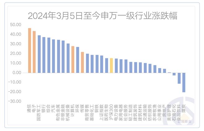 在本轮人工智能行情中,自2024年3月5日第一次提到人工智能+以来,以通信、电子则代表TMT,以超过40%的涨幅傲视所有申万一级行业~