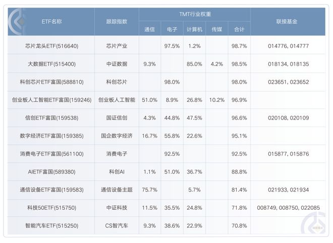 富二梳理了富国基金旗下关注TMT含量比较高的行业主题ETF及联接基金,覆盖芯片、大数据、信创、通信设备、消费电子、智能汽车等科技上下游领域,另外亦有布局科创板、创业板单一上市板块的指数基金,对想要布局TMT的客官,可以多多关注~
