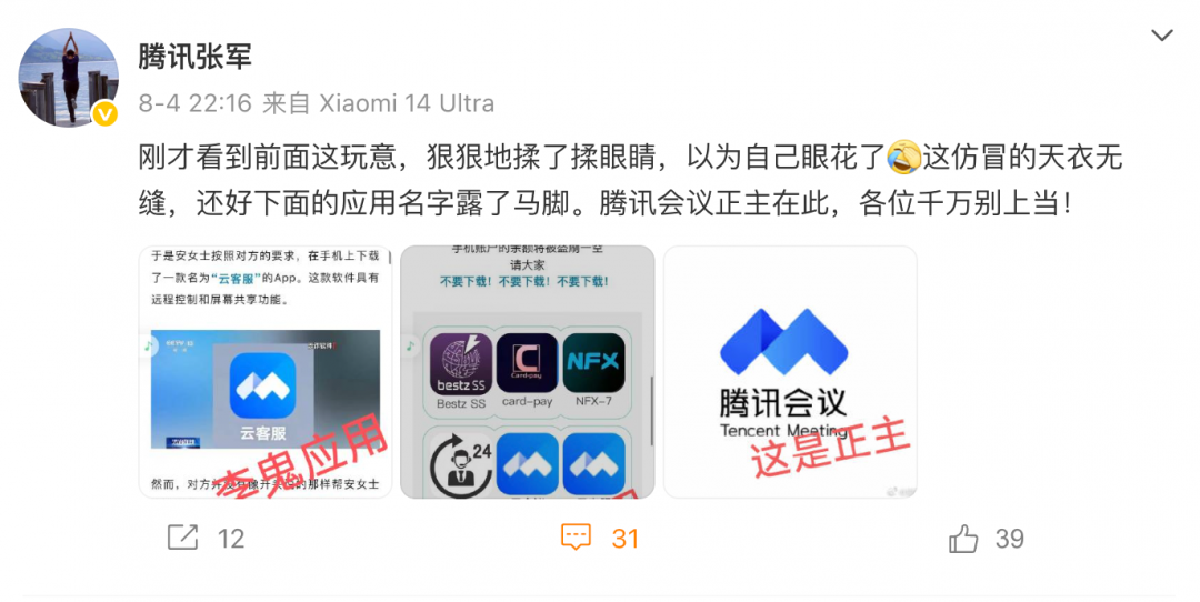 据介绍,“云客服”App不仅含有屏幕共享和远程操控的功能,同时还有人脸识别功能。一旦下载,诈骗人员会远程操控你的手机界面,手机账户的余额将被盗刷一空。值得注意的是,“云客服”App的图标和腾讯会议一模一样,很容易让人误下载导致被骗。