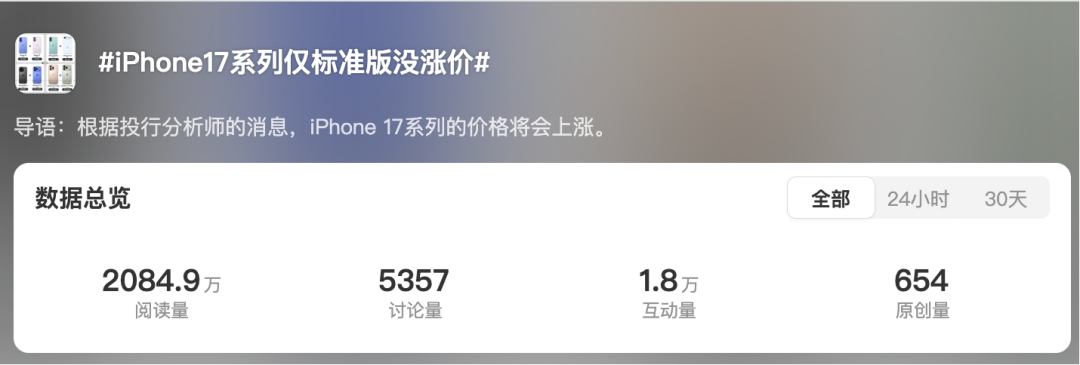 今日,“iPhone 17系列仅标准版没涨价”冲上微博热搜,引发热议。截至发稿,相关线万。根据投行分析师的消息,iPhone 17系列的价格将会上涨,普遍涨价50美元,仅标准版没涨。