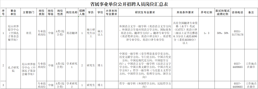 根据事业单位公开招聘有关规定,结合工作需要,尼山世界儒学中心(中国孔子基金会秘书处)拟面向社会公开招聘人员1名,孔子研究院拟面向社会公开招聘人员3名。具体岗位详见《省属事业单位公开招聘人员岗位汇总表》。