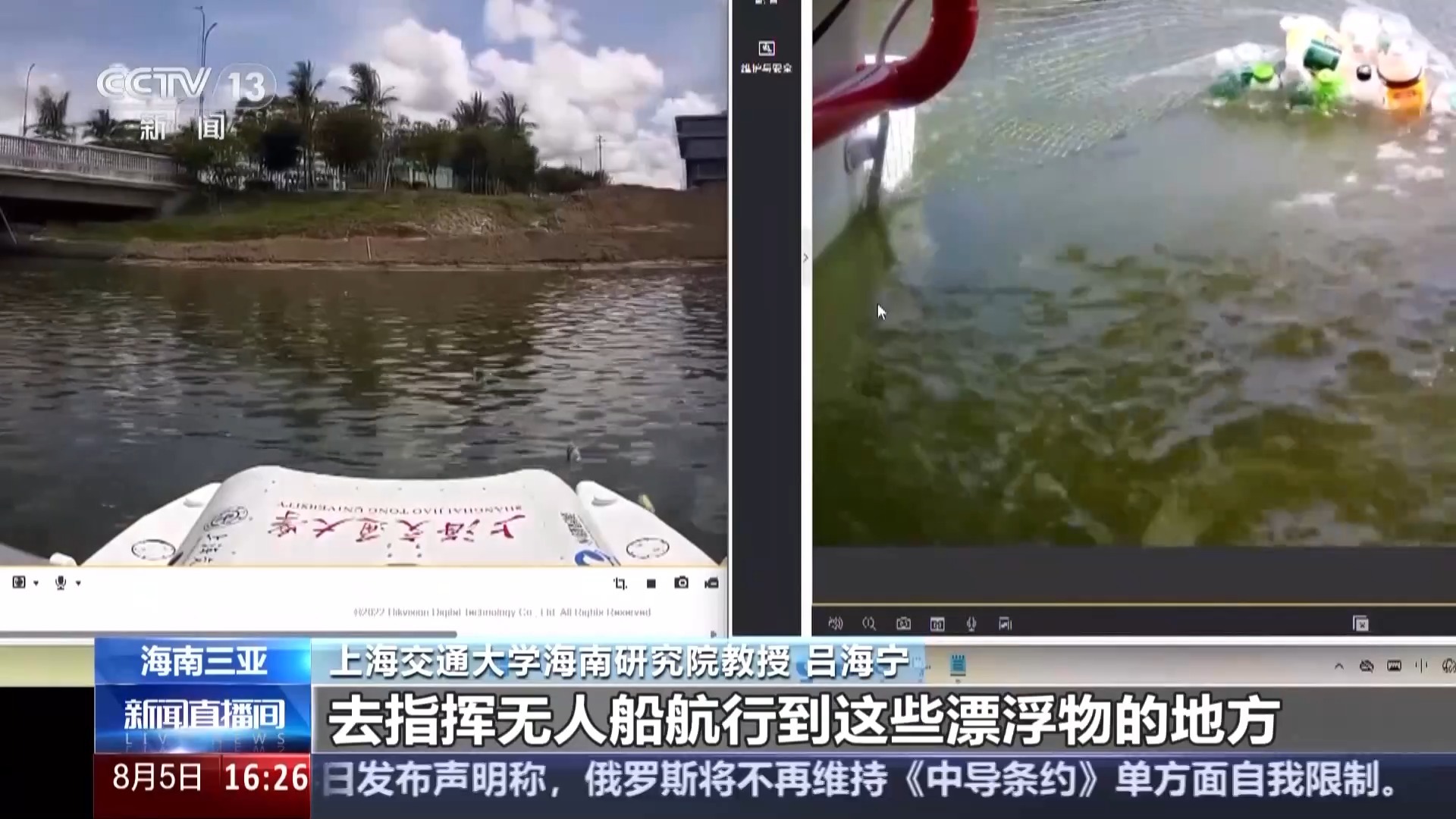 上海交通大学海南研究院教授 吕海宁:它能够在水面自主进行路径的规划和航行,同时它配有一个比较强大的环境感知系统,能够实时构建水域环境地图,实现实时路径规划。同时,我们开发的智能水面漂浮物识别的算法,能够(在)自主判断以后,就像人的大脑一样,去指挥无人船航行到这些漂浮物的地方,进行一个智能清扫作业。