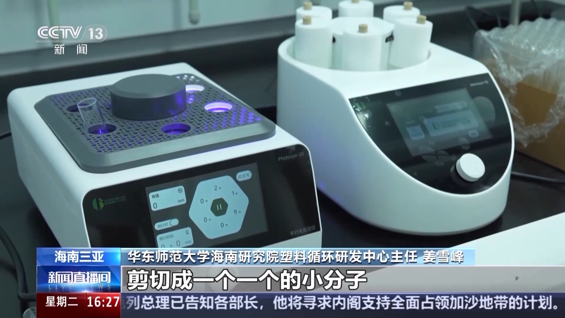 华东师范大学海南研究院塑料循环研发中心主任 姜雪峰:大家都知道什么是工程塑料,硬度和强度都非常高的一种塑料,我们拿机械力都没办法摧毁它,我们用光照条件加上光催化剂,就像一个剪刀手一样,就可以很轻松地把它剪切成一个个的小分子,回到它原来的状态,让我们重新利用,这样我们就实现了在科学上的闭环循环体系。