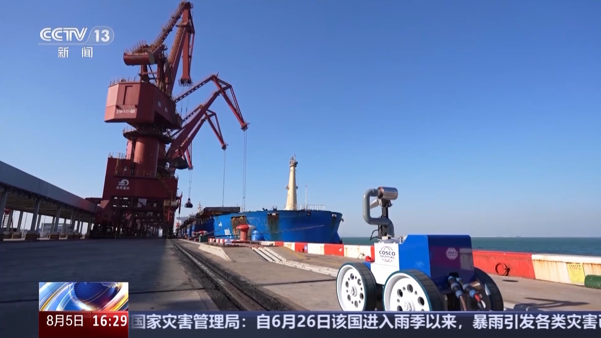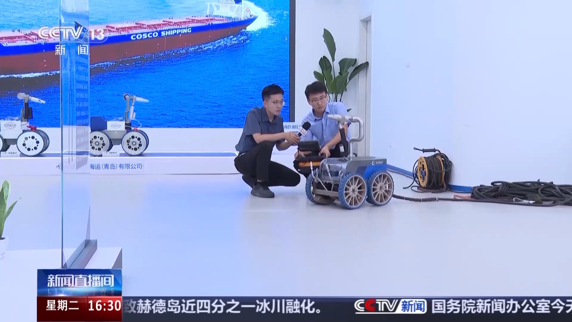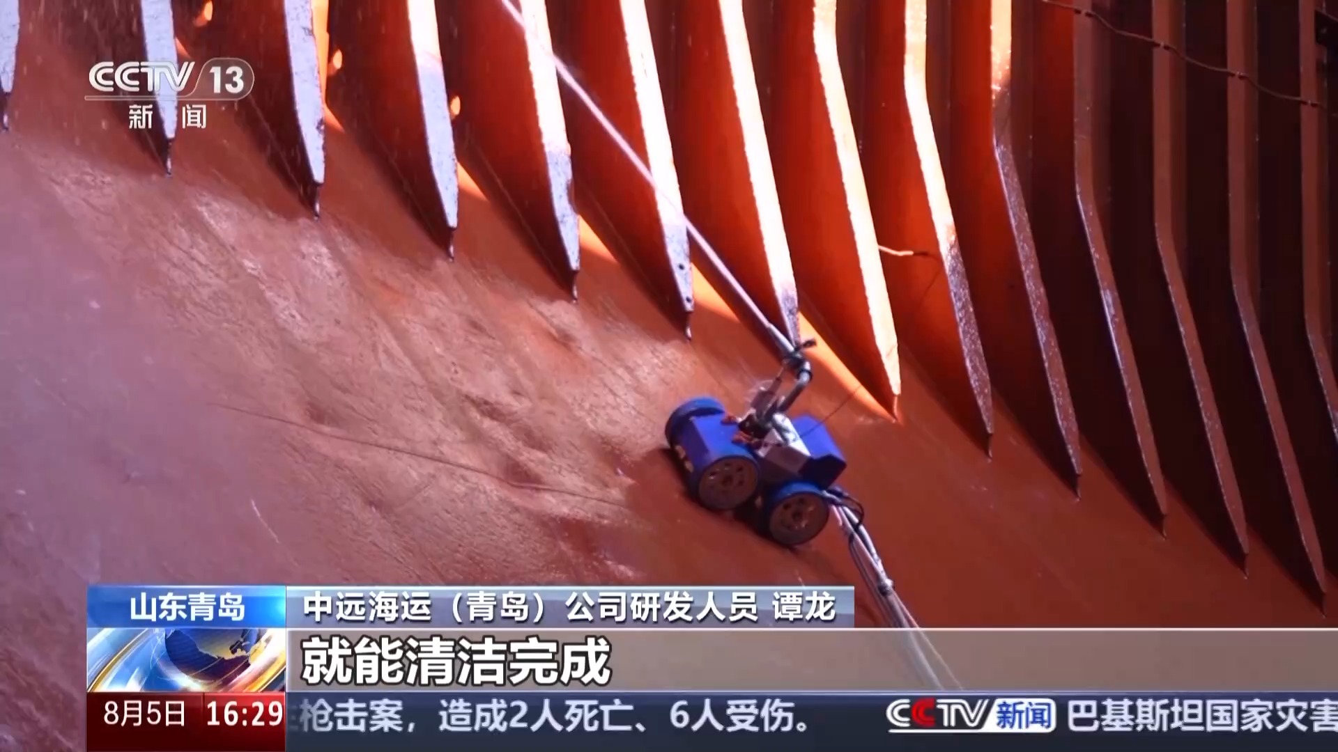 中远海运(青岛)公司研发人员 谭龙:像这样一台小小的机器人,它每个小时能清洗超过900平方米的面积,一个货舱它只需要3个小时就能清洁完成,对于一艘220多米长的散货船,它只需要24个小时就能清洗完成,相较于传统的人力作业,它不仅提高了清洗效率,还显著降低了人力作业成本。