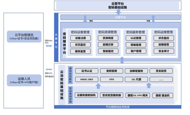 本案例根据《密码法》、《网络安全法》等法律法规要求,结合云管平台自身特色,采用国密算法(SM2/SM3/SM4)替换国际算法,实现密码资源池化管理和服务标准化,支撑关键数据存储、传输、身份认证及运维审计等场景,保障系统密码应用安全,针对性提出安全解决方案。