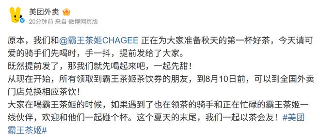 对此,美团外卖在微博回应称:原本,我们和@霸王茶姬CHAGEE 正在为大家准备秋天的第一杯好茶,今天请可爱的骑手们先喝时,手一抖,提前发给了大家。