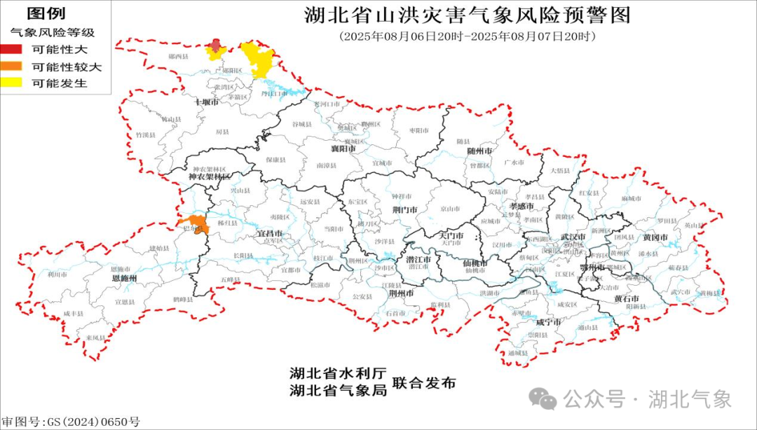 湖北省水利厅和湖北省气象局 2025 年 08 月 06 日 20 时联合发布红色山洪灾害气象预警。预计 2025 年 08 月 06 日 20 时至 08 月 07 日 20 时,下列地区存在山洪灾害风险:
