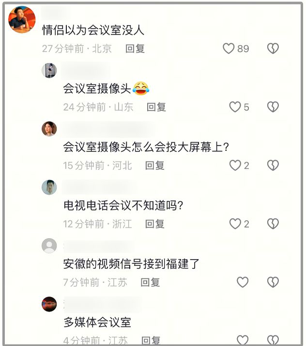 对此,有网友十分好奇,这对男女为何会在会议室旁若无人的亲热,亲热的画面又怎么会出现在网上呢?