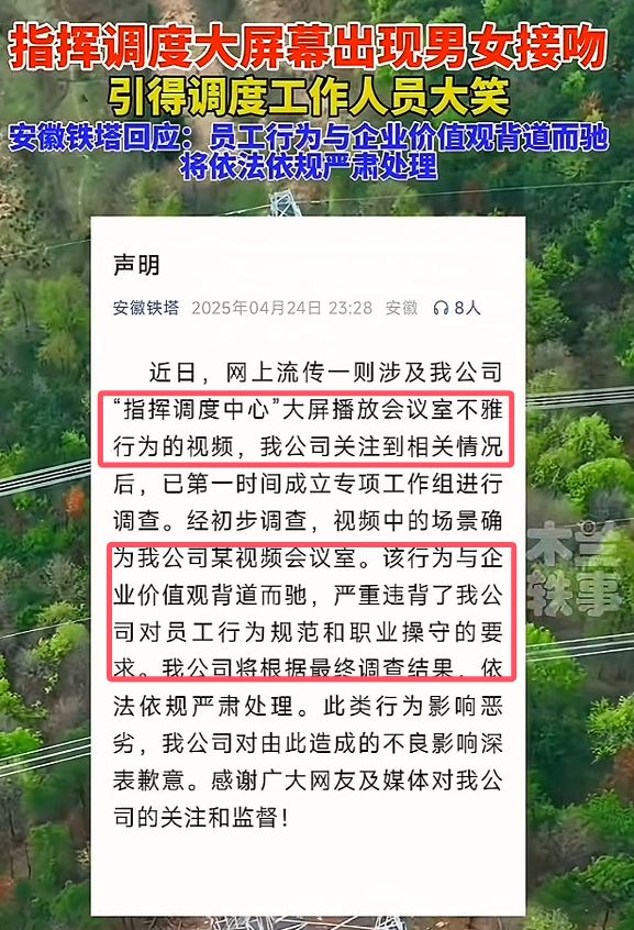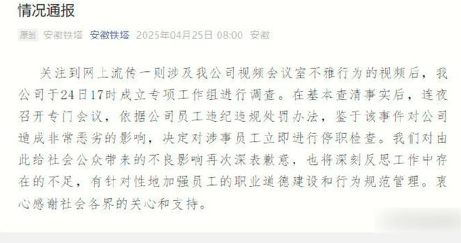 事情闹大后,安徽铁塔也是十分重视。在24日凌晨就发布声明,表示已经第一时间成立专项工作组进行调查,确认视频中的场景确实是公司某视频会议室。