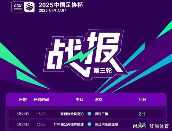 北京时间5月21日,2025赛季足协杯第三轮将继续进行,中超球队全数出战。在昨天进行的第一个比赛日中,中超3队出战有2队爆冷出局,其中,武汉三镇在一球领先的情况下被中甲排名第13的陕西联合连追两球完成逆转,梅州客家以同样的剧情被中乙南区第1的广西恒宸2-1逆转,只有浙江1-0战胜中乙南区第5的广州蒲公英惊险晋级。