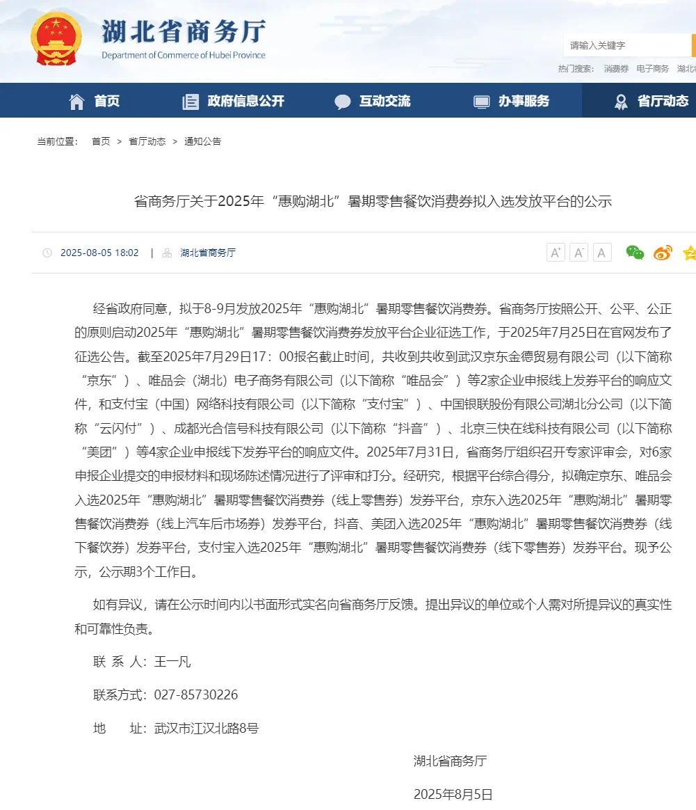 8月5日,湖北省商务厅发布《省商务厅关于2025年“惠购湖北”暑期零售餐饮消费券拟入选发放平台的公示》。