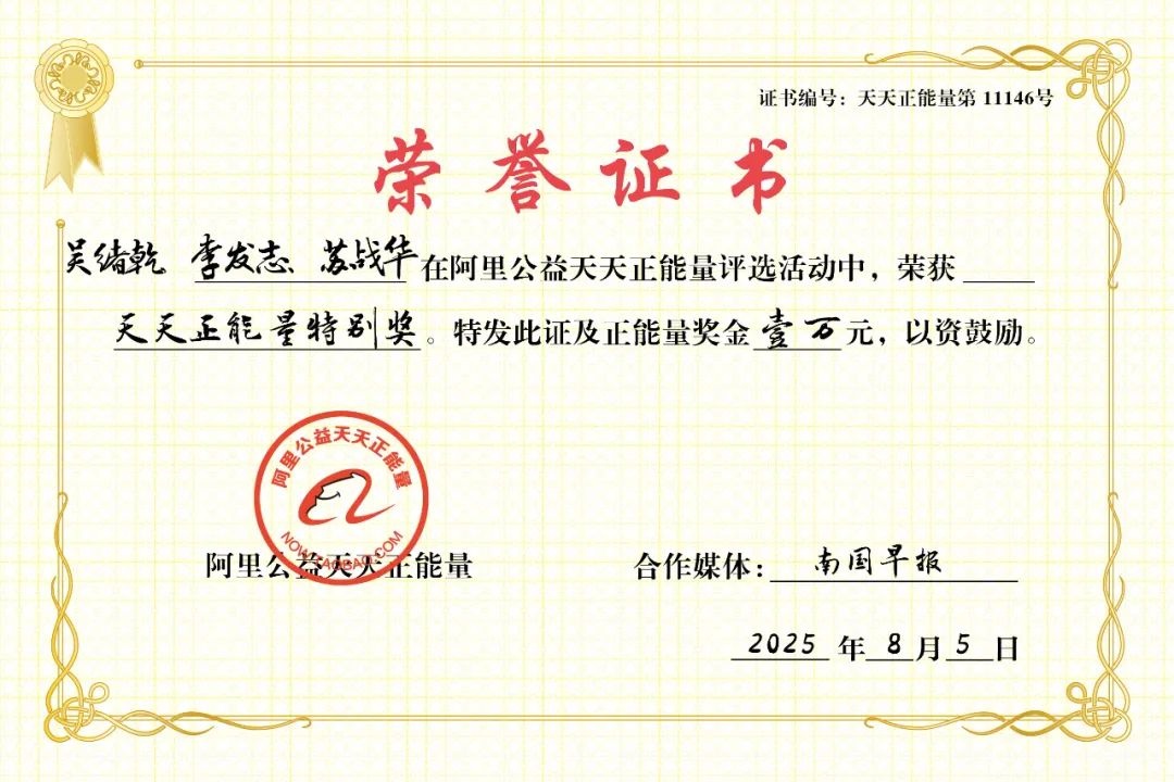 8月5日,广西云-南国早报联合阿里公益天天正能量,为吴绪乾、李发志、苏战华颁发正能量特别奖,并奖励10000元,致敬这份在暴雨中巍然屹立的人性光辉。