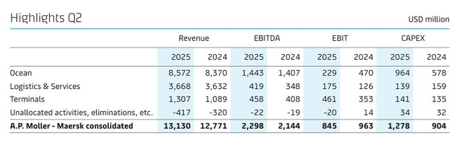 马士基的扩船动作,与其稳健的财务表现形成呼应。今天下午其刚刚发布的财报显示,2025年二季度公司实现营业收入达131.3亿美元,同比增长2.8%;息税折旧摊销前利润(EBITDA)为22.9亿美元,同比增长7.2%;息税前利润(EBIT)为8.45亿美元,同比下降12.3%,利润率为6.4%;净利润为6.4亿美元,同比下降23.3%。