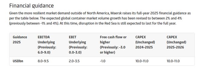 其中,集装箱海运业务实现营收85.7亿美元,EBITDA为14.4亿美元,EBIT为2.3亿美元;箱量同比增长4.2%至323万FFE,但平均运费下滑至2259美元/FFE,同比下降9.6%。物流与服务部门EBIT达1.8亿美元,利润率提升至4.8%;码头业务表现亮眼,EBIT同比增长31%至4.6亿美元。基于北美以外地区更具韧性的市场需求,马士基上调2025年全年EBITDA预期至80–95亿美元,EBIT预期至20–35亿美元。