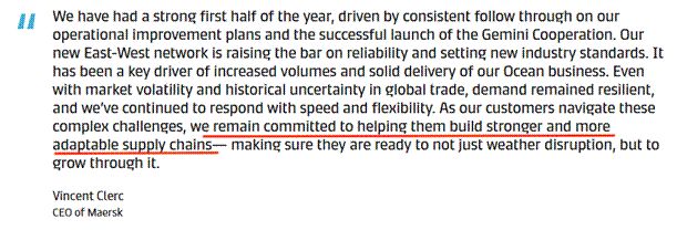 马士基CEO柯文胜在最新的第二季度的财报总结中说道:“我们将继续致力于服务客户,帮助他们打造更加强劲、更具灵活性的供应链。”