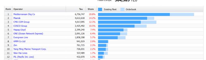 据Alphaliner数据显示,马士基全球集装箱公司运力排名第二,总计416.2万TEU,现有订单仅有49艘,对比与其竞争对手MSC(134艘)和达飞(94艘)略显单薄。