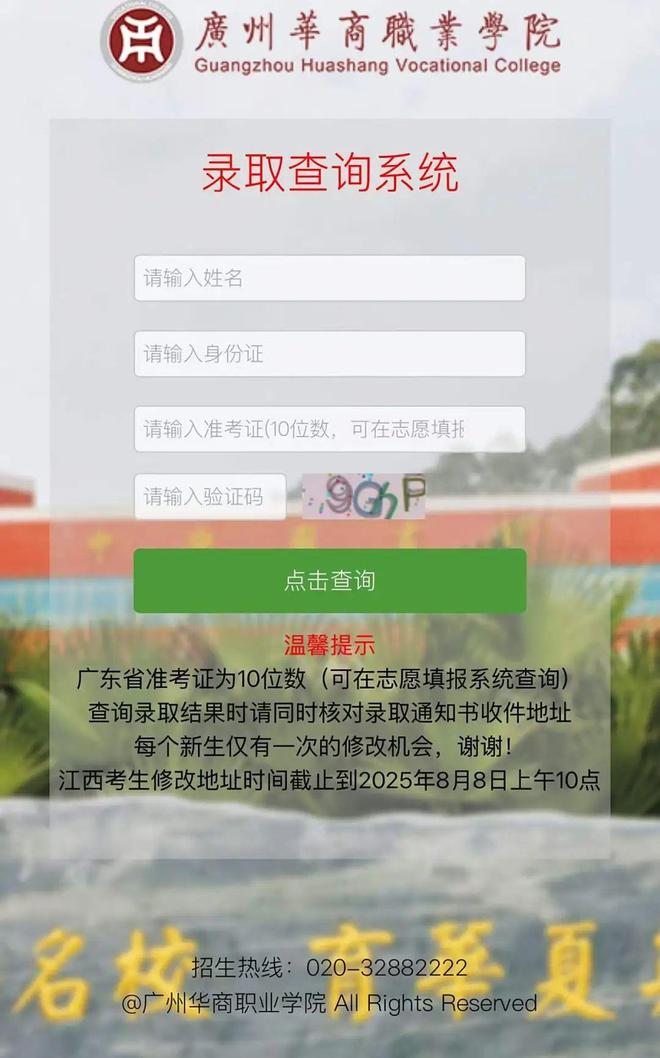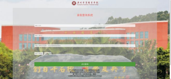 2. 进入广州华商职业学院招生网→点击信息查询→录取查询→输入姓名、身份证号、准考证号(10位数,可在志愿填报系统查询)和验证码,点击查询录取信息。