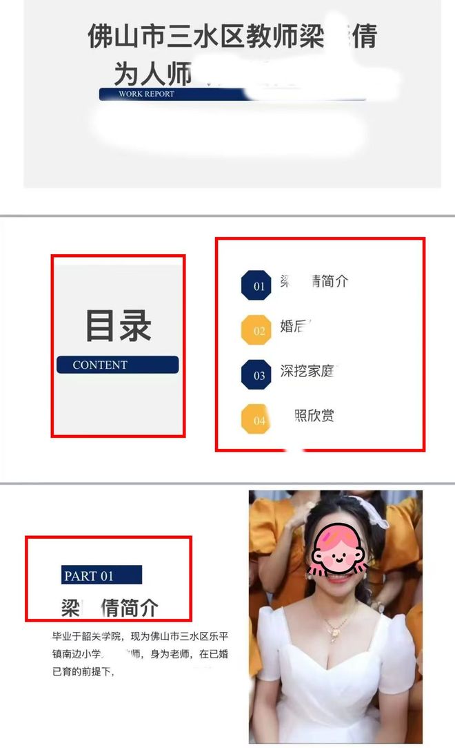 近日,佛山三水区乐平镇南边小学女教师梁某倩被举报婚内出轨多人,举报者专门制作了一份15页的PPT来说明此事。接下来,笔者带着大家逐一欣赏!