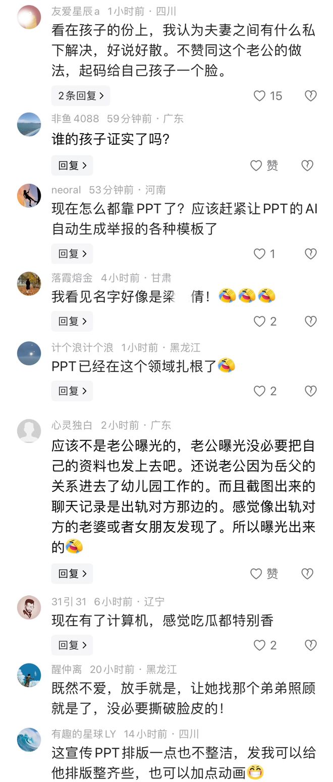我认为这个PPT不是梁某倩老公制作的,那是谁制作的这个PPT?不知道大家注意到没有,这些聊天记录的截图者手指上明显美甲,所以这个聊天记录不是梁某倩老公所截取的。这件事当中,受到伤害最大的肯定是梁某丈夫以及女儿,当然梁某的其他亲人也会因为这件事受到影响。