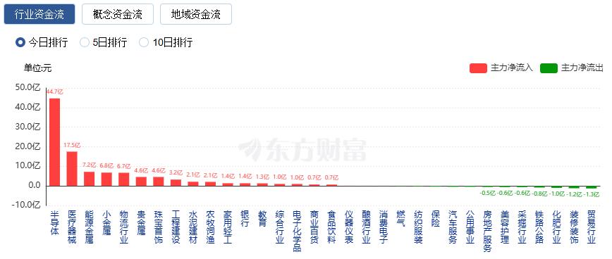 行业资金方面,截至收盘,半导体、医疗器械、能源金属等净流入排名靠前,其中半导体净流入44.67亿。