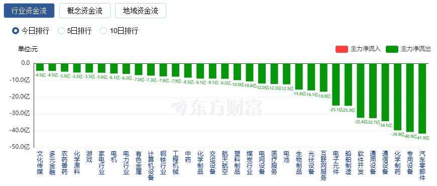 500)this.width=500 align=center hspace=10 vspace=10 alt=净流出方面,汽车零部件、专用设备、化学制药等净流出排名靠前,其中汽车零部件净流出41.85亿元。