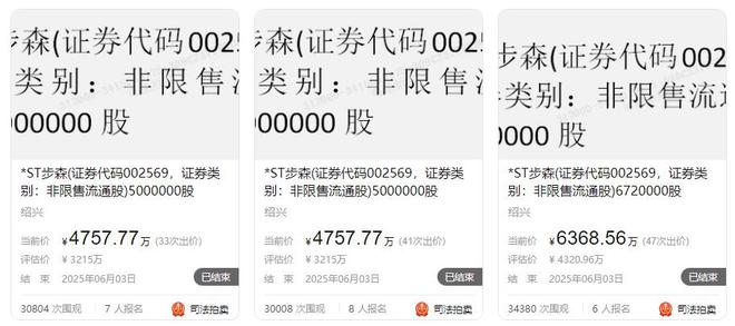阿里拍卖网站还显示,拍品所有人为上海睿鸷资产管理合伙企业(有限合伙),即*ST步森二股东;依据法院执行裁定书,上述1672万股股票已被绍兴市中级人民法院冻结。对照*ST步森2025年一季报数据,股票过户后,王波、韩伟、张庆北将进入*ST步森前十大股东名单。
