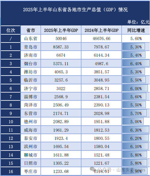 根据山东省统计局发布的数据,山东省上半年生产总值达50046亿元,按不变价格计算,同比增长5.6%,高于全国平均增速0.3个百分点,稳居全国前三,山东首次在半年度突破5万亿元大关。
