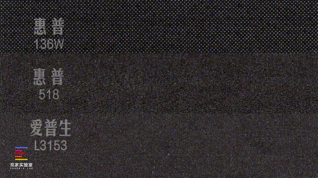 爱普生和惠普的两款墨仓打印机,它们的纯黑色填充和灰度区分甚至比惠普136w做得还更好一点,可惜文字方面的解析力稍弱,总的来说也都能排在第一梯队。