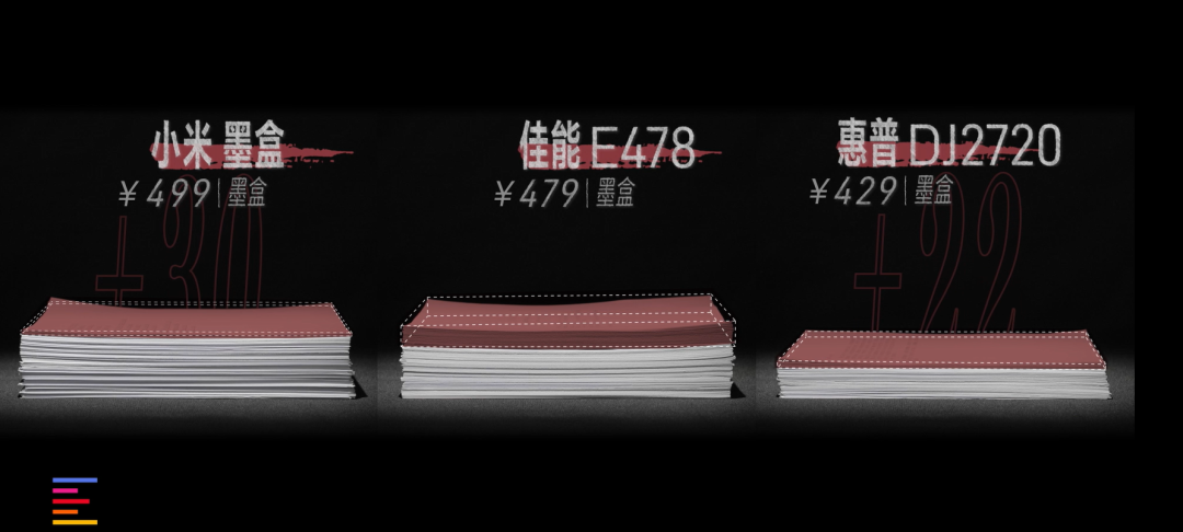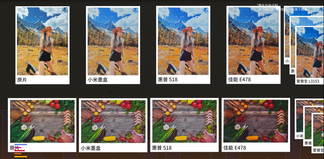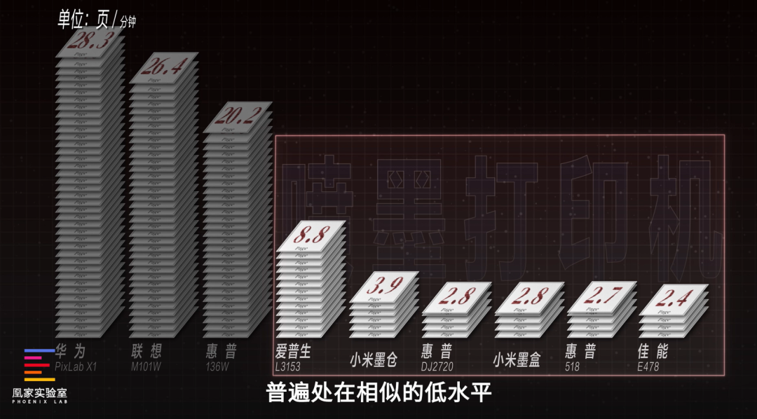 结果的对照非常强烈:所有的喷墨打印机,普遍处在相似的低水平,小米墨仓相对好一点点,只有爱普生表现较为突出。