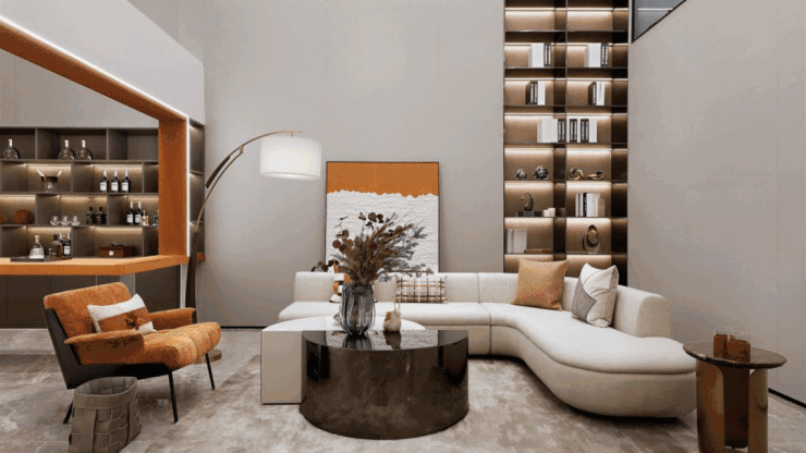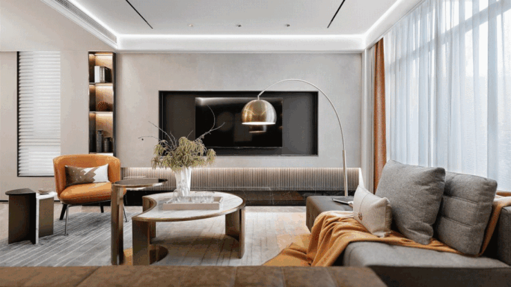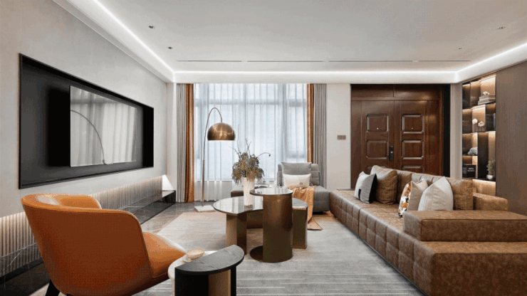 样板间一层层高3.3米,整个客厅南向开间6.7米,空间尺度感强,迎合现代人对大空间活动公区的偏好,朝南客厅大面积落地窗直面小区万方公园实景。楼梯中间,预留了电梯井的位置,可安装户内家用电梯。