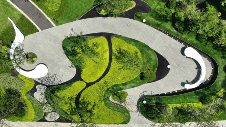 园区景致,从曲径通幽处起始,穿过月洞门,将外界的喧嚣经由林荫小径,变换为静谧的归家心境。复行数十步,会听到水声流鸣,仿若弯月的一池水景映入眼帘,潋滟的波光倒映着一畔的景亭,传统文人笔下的雅集之趣与山水气韵悠然而至。