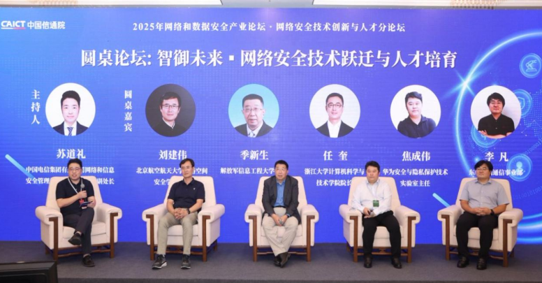 分论坛期间以“智御未来▪网络安全技术跃迁与人才培育”为主题,举办了圆桌对话。中国电信集团有限公司网络和信息安全管理部云网安全管理处苏道礼副处长作为圆桌对话主持人,与北京航空航天大学网络空间安全学院刘建伟院长、浙江大学计算机科学与技术学院任奎院长、信息工程大学季新生教授、华为安全与隐私保护技术实验室焦成伟主任、东软集团通信事业部李凡副总经理开展对话交流。