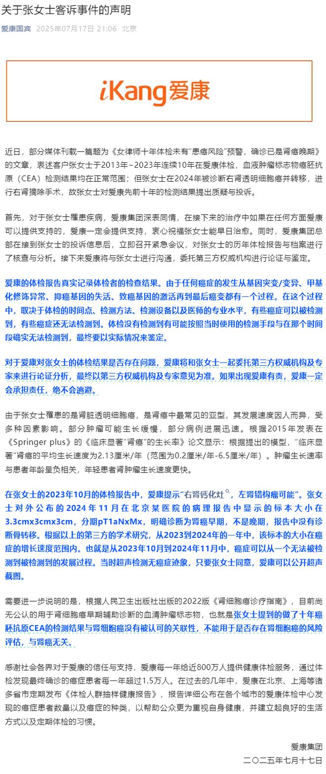7月14日,家住北京的执业律师张晓玲向记者投诉,称她在爱康国宾健康体检管理集团有限公司(下称爱康国宾体检)设于北京的体检分院连续体检10年未被检出患癌风险,2024年被发现患癌时已是晚期,她质疑爱康国宾体检涉嫌“误检、漏检”。