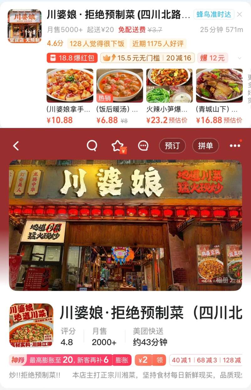 “川婆娘”在饿了么的头像是一家橘色招牌门店,门口站着一些顾客,标明“堂食店、无预制”;在美团的头像是菜品,相册大图却是另一种风格的门店图。记者现场探访,该店位于一间大厦二楼的美食城,内部有众多外卖档口,外卖员来往穿梭,个别商家摆出一两张桌椅,但无人现场就餐,整体环境也不适合堂食。