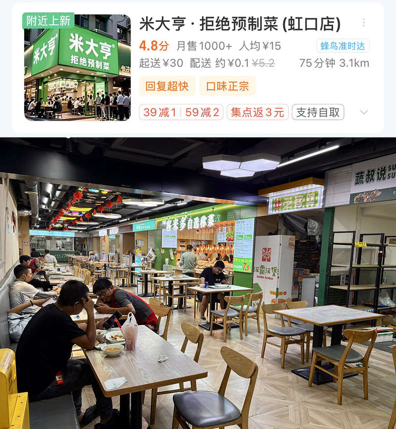 “米大亨”显示为一家新店,头像是绿底白字的招牌下,店内外满座且排起长队。根据地址,记者找到一处商场的地下美食城,门店众多,现场确实有些人在吃饭或休息。然而并没有“米大亨”的招牌,门牌号显示的其实是一家自选称菜的快餐店。