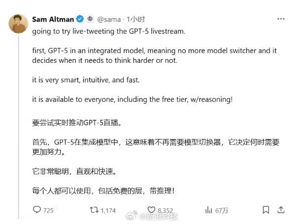 奥特曼在 X 平台发布推文,将 GPT-5 模型的亮相,比作苹果初代 iPhone,认为用户在体验过后就不会放手。