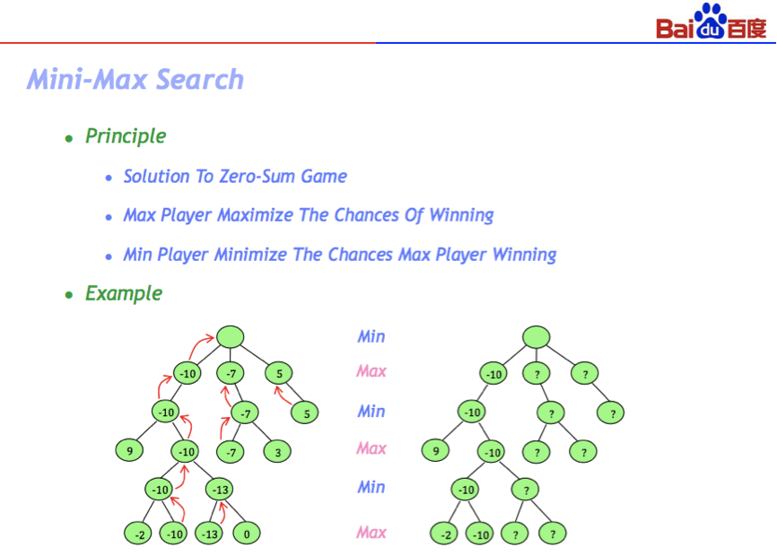 在介绍完蒙特卡洛搜索的背景后,杨老师便开始展开具体的技术知识分享。他首先给大家展示了一个树型结构图(Mini-Max 搜索),这是临河博弈的解决方案,据说还是五十年代提出来的。蒙特卡洛搜索实际上就是基于Mini-Max 来做的。九十年代初,有一个德国人就把它首先用在了围棋上,但是那时候效果很差,所以他在论文中也提到了,看上去很好笑的一个方程,他没有办法用计算语言告诉你,黑一定好,还是白一定好,至少他翻译不成计算语言。另外,棋盘上众多的闲点,每一个点价值最大,ABCD,哪些值值多少分,它是没办法告诉你的。所以早期的阿尔法贝塔搜索,在搜到E 节点的时候,会写一个屏盘数,让这个去决定哪个点好,哪个坏,返来。如果这个不准的话,搜索肯定是一塌糊涂。后来蒙特卡洛这个办法,既然到了一个点不知道哪个好,哪个坏,就干脆一直搜,搜到我们可以判别的状态,这样我们就很容易判断,这个围棋的胜负了。