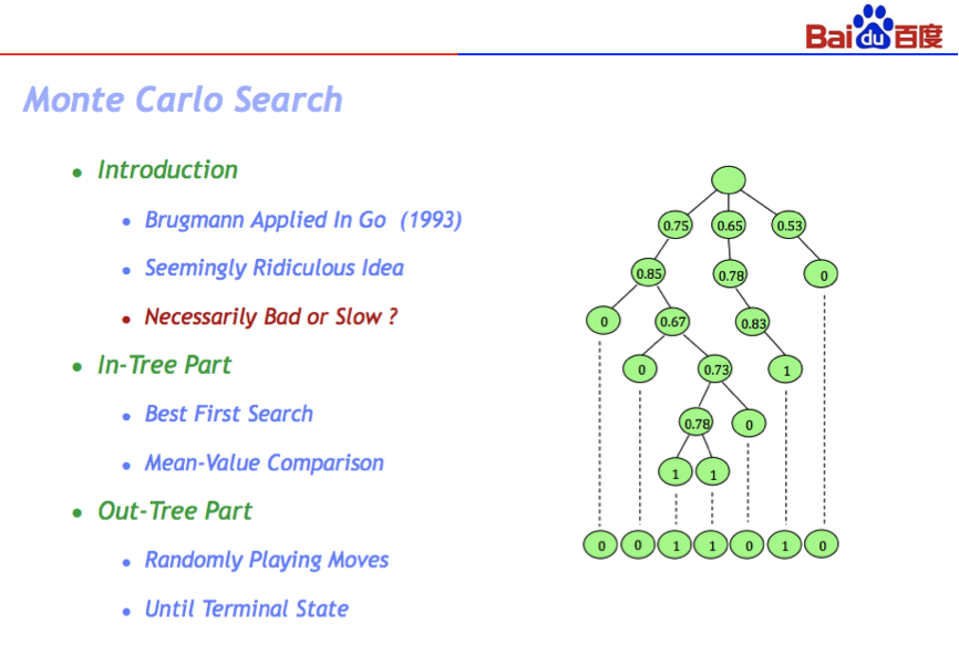 关于蒙特卡洛搜索其实包含两个部分,一个是In-Tree 部分和Out-Tree 部分。In-Tree 的时候究竟怎么搜索?Out-Tree,蒙特卡洛的思想就是一个随机下子,就是说既然过了树节点和叶子节点以后,双方可以随机在棋盘上扔,扔到一个状态后我们再数一下谁赢谁负了。但是一次搜索肯定不行的,我们经过大量仿线 是一个均值,就是说走这条路75% 赢了。我们大量做这样的仿真,然后每一个节点的时候我们选择均值最大的那个分值,蒙特卡洛搜索的基本思想就是这样。