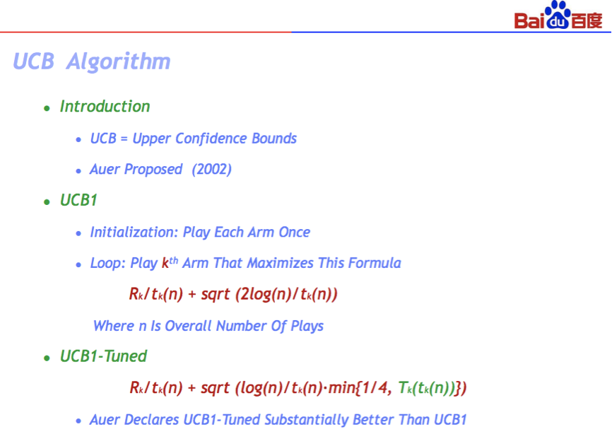 当然蒙特卡洛搜索它还是不够准确,其实最关键的原因在于:我们在每一个树节点的时候,怎么判断应该往哪边走,这个很困难。这里面还是有些很深的东西在统计学上。我们可以探索它的均值是不是最好,多去利用它。首先要解决探索与利用的平衡。2002 年,一个奥地利人提出了UCB 的计算,这个算法要求刚开始的时候,赌徒每次都试一次,试完一次以后,就开始做选择了,我们看一下这个地方有这个公式,R,表示我现在第K 个手臂拿到了所有的金币数,TK(N)表示在N 次试验中,第K 个手臂总共实验的次数,也就是说R/T 是均值,后面是一个根号,这个叫做一个探讨项,就是我们刚才说的,前面的是均值最大,当然均值最大不是我们一定要的,所以我们需要有一个探索项,我们每一次做选择的时候,实际上是要求最大的整个公式,我们就选择这个。