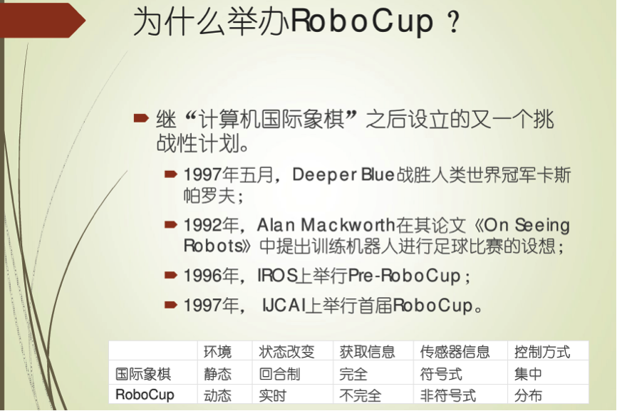 1997 年,深蓝战胜了当时人类的第一把交椅,就是国际象棋上的卡斯爬罗副,这作为国际象棋上非常标志性的节点,这个就意味着人工智能再往下发展要有一个新目标。新目标选择什么好呢?经过几年的讨论,包括在阿尔斯国际会议上进行初步性探索比赛之后,正好在 1997 年的时候深蓝取得这个胜利,这个作为人类标志性任务结束了,一定要拿到下一个任务,这个任务在 ICI 上正式把这个题目确定下来,实际当时没有把中国围棋考虑进去,因为它和国际象棋的内容一样,虽然围棋会更难。机器人踢足球,大家想人踢足球的时候,不仅仅在动,对手也在动,时时刻刻是动态的环境,这是最主要的区别。另一个,就是状态的不同,下棋的时候你一步,我一步,轮流下,在踢足球的比赛里完全是一个实时性对抗,踢足球必须在最准确的时间做最准确的选择。第三,信息的获取。因为在围棋里面或者象棋里面,还有其他棋里,你所有的状态是准确的,所有的信息是完全准确的,就是计算机里取到的数据没有任何的区别,但是踢足球不一样了,这个我想大家踢过球都应该了解这个情况,你不可能对全局的状况有一个全面的了解,即使解说员在上面,你也可能只关注比赛的一部分,你如何通过一部分的信息能够判断整体的局面,那就出现了很多很多不一样的地方。无论分布还是集中,各有各的优点,各有各的弱项,所以在不同领域的应用也不一样,不见得分布一定好,或者集中好,这有很大的差别,看具体的应用。