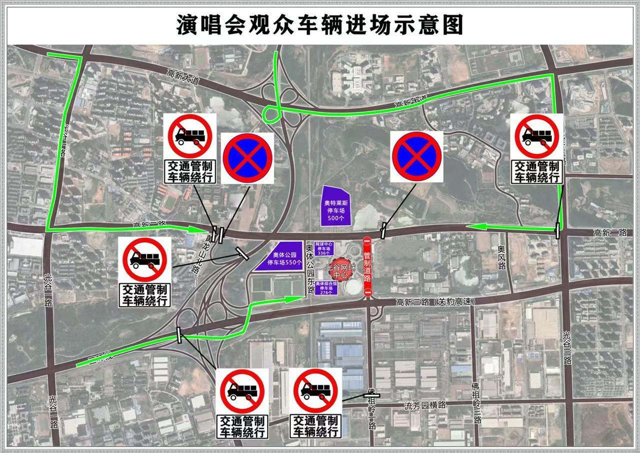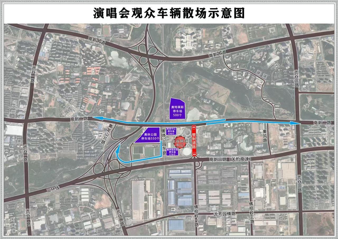 (4)奥体公园三号路、奥体公园南路实行单向通行,奥体公园路停车场出场车辆一律由奥体公园东路、奥体公园南路驶入三环线)高新二路西向东车辆引导至光谷三路上高新大道;高新二路东向西车辆引导至光谷一路上高新大道。
