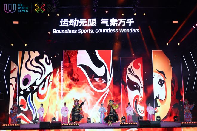 作为世运广场正式运行后的首个主题夜演出,“运动无界——巴蜀之夜”主题节目表演融合了体育、戏曲、流行等多种元素:歌手王江元携本届世运会的推广曲《登峰》激情开唱,振奋人心的节奏与世运精神交相呼应;遂宁市带来杂技表演《策马急急风》和川剧《涪涟戏萃》:杂技表演昂扬之气呼之欲出,惊、奇、趣、险汇聚,现场观众无不屏息;川剧表演大气雄浑,融入了水袖、长绸、变脸、吐火、六头变脸等技巧,变脸环节吉祥物蜀宝和锦仔的面孔惊喜显现,引得台下阵阵掌声。凉山州带来的彝族男子群舞《少年飞马》,少年舞者们英姿飒爽,舞蹈动作一气呵成,仿佛将现场观众带到了广袤的凉山高原。从热血世运到巴蜀风采,歌舞、杂技和非遗国粹在今晚强强联手,视听盛宴让人直呼过瘾。