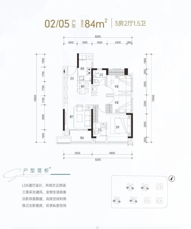 建面约84㎡是传统竖厅动静分区格局,客厅进深7.55米(不含阳台),开间3.4米,主卧8.4㎡(不含主卫和飘窗),空间确实会偏紧凑一点,但没什么硬伤,实用性还是非常不错的。