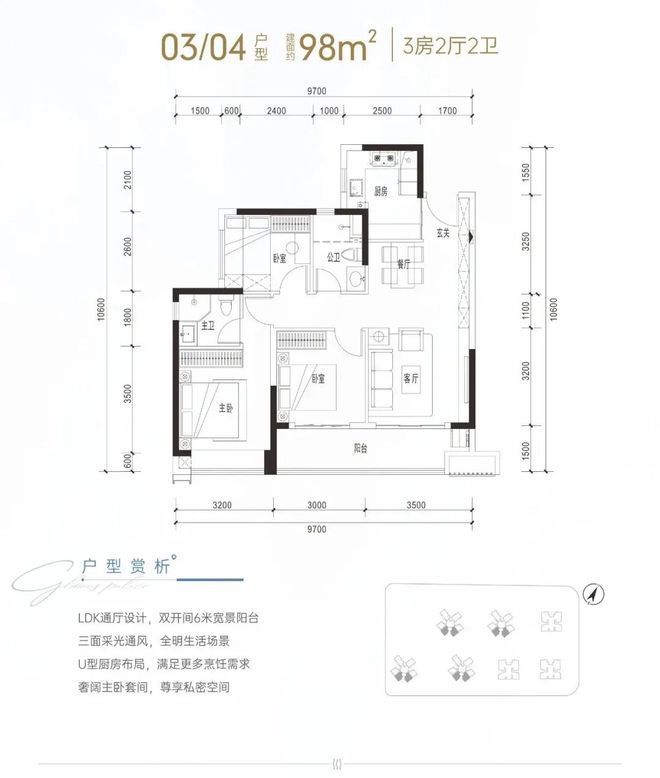建面约98㎡是传统竖厅动静分区格局,客厅进深7.55米(不含阳台),开间3.5米,配有6.5米宽景阳台,主卧13.18㎡(不含主卫和飘窗),客厅空间变化不大,但厨房和卧室空间要好很多,居住的舒适性会比较好。