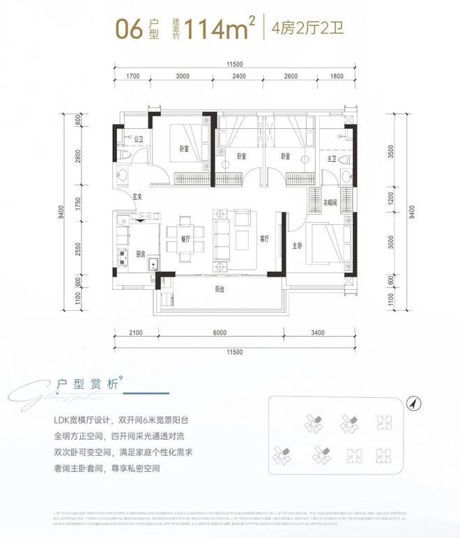 建面约114㎡是传统短进深大开间横厅格局,通透性很好,客厅进深6米,开间4.3米(不含阳台),配有6米宽景阳台,主卧套间设计,配衣帽间和三段式卫生间,这个户型很比较讨喜年轻的购房群体。